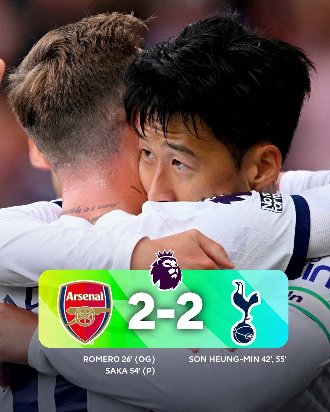 英超第6轮,阿森纳主场2-2战平热刺,萨卡造乌龙+点射,罗梅罗乌龙+送点,麦迪逊两次助攻孙兴慜扳平。