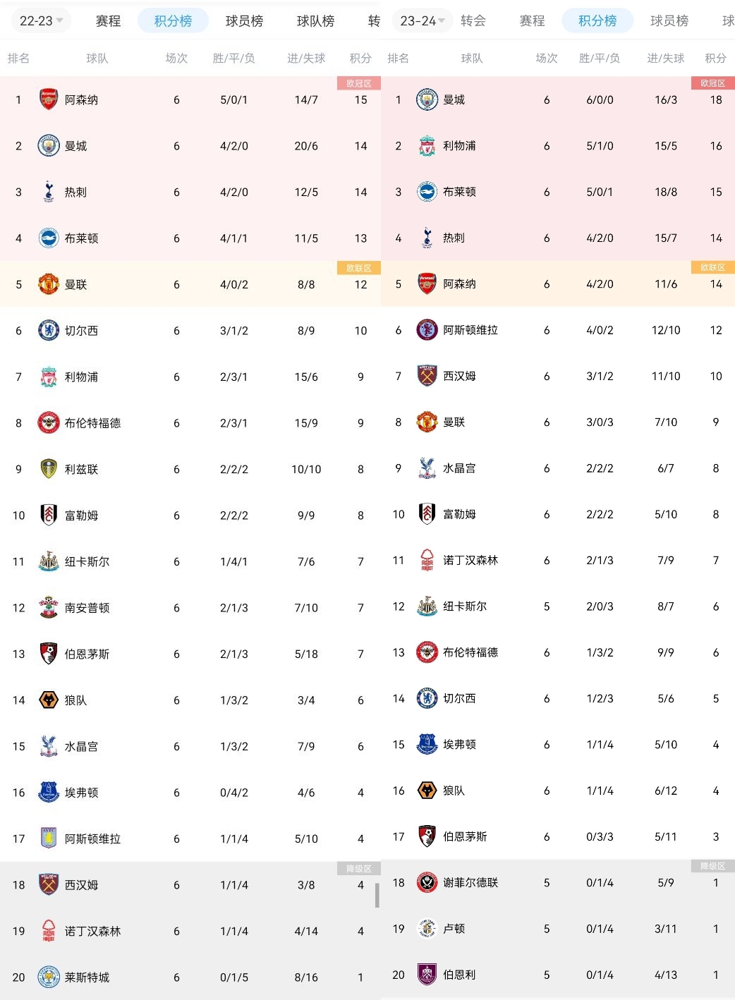 找不同啦😎上赛季和本赛季6轮过后的英超积分榜,你能找出几处