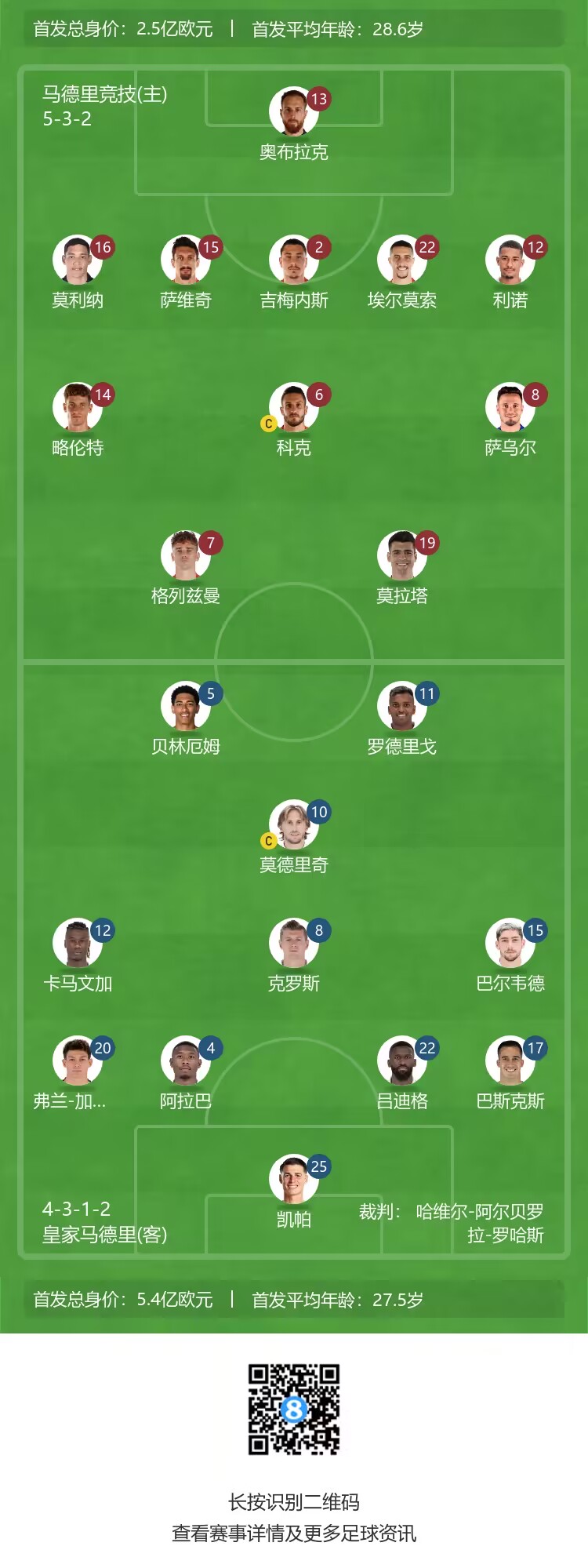 皇马首发:25-凯帕、17-巴斯克斯、4-阿拉巴、22-吕迪格、20-弗兰-加西亚、12-卡马文加、8-克罗斯、10-莫德里奇、5-贝林厄姆、15-巴尔韦德、11-罗德里戈