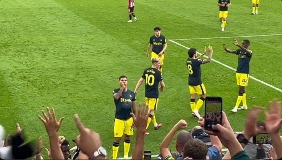 在对谢菲联进球后,吉马良斯冲向喜鹊球迷看台并高喊:“我他x的将会留下来!”(I'm f**king staying!!)