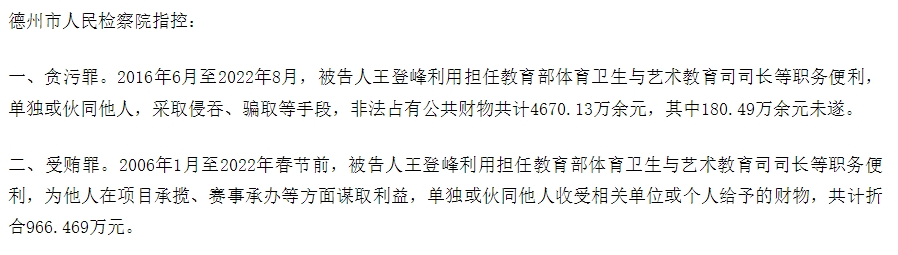 王登峰是教育部体育卫生与艺术教育司原司长,也曾担任中国足协副主席。根据此前检察院的指控,王登峰涉嫌贪污、受贿,他的涉案金额达到了5636.599万元。其中贪污4670.13万余元(180.49万余元未遂),受贿966.469万元。