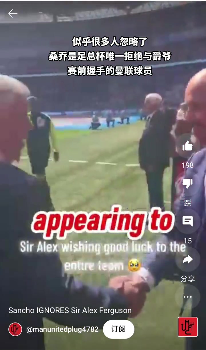足总杯决赛入场时,曼联首发11人中的10人以及主帅滕哈赫均和弗格森握手打招呼,只有桑乔直接走过。