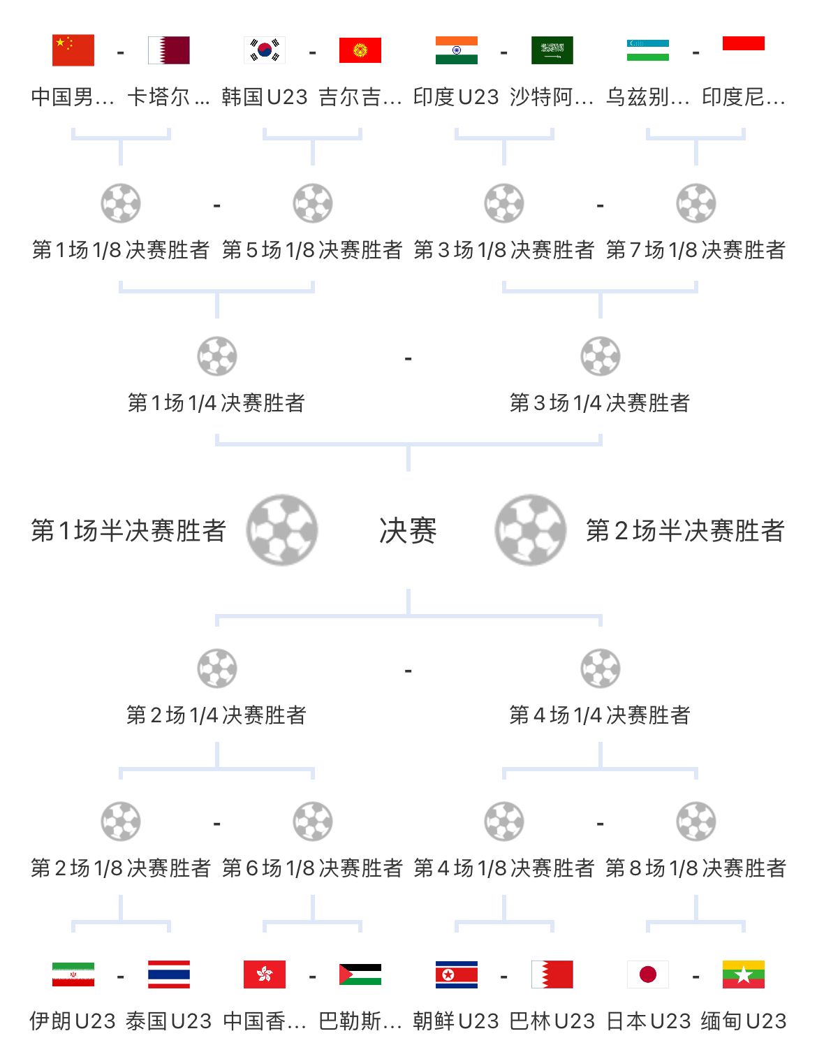 卡塔尔U23替补:21-阿里-科拉耶姆、22-阿米尔-卡图勒、3-赛义夫丁-法德拉拉、12-阿卜杜拉-苏莱提、5-阿卜杜勒拉赫曼-扎基、8-纳伊夫-哈德拉米、17-迈赫迪-迈贾巴、7-卢特菲-马杰尔、10-哈立德-本萨巴、14-伊勒耶斯-布里米勒