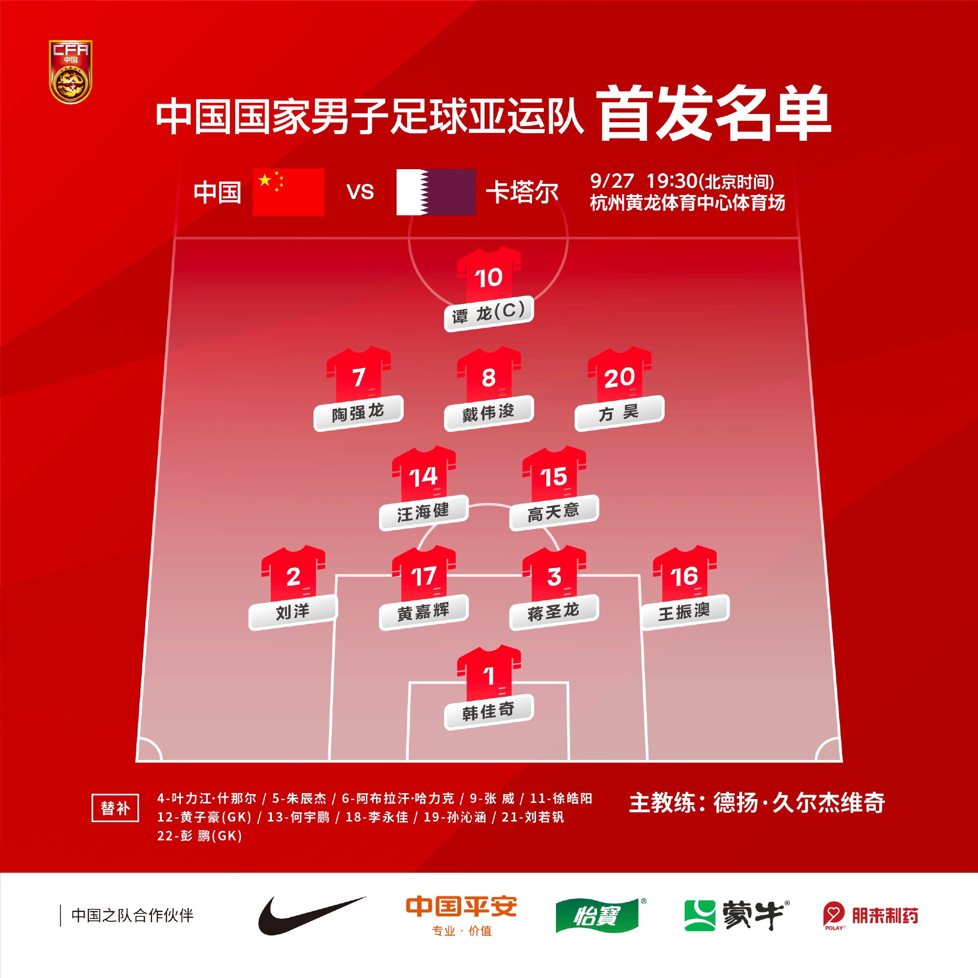 中国男足亚运队首发:1-韩佳奇、2-刘洋、3-蒋圣龙、16-王振澳、14-汪海健、15-高天意、17-黄嘉辉、7-陶强龙、8-戴伟浚、10-谭龙、20-方昊