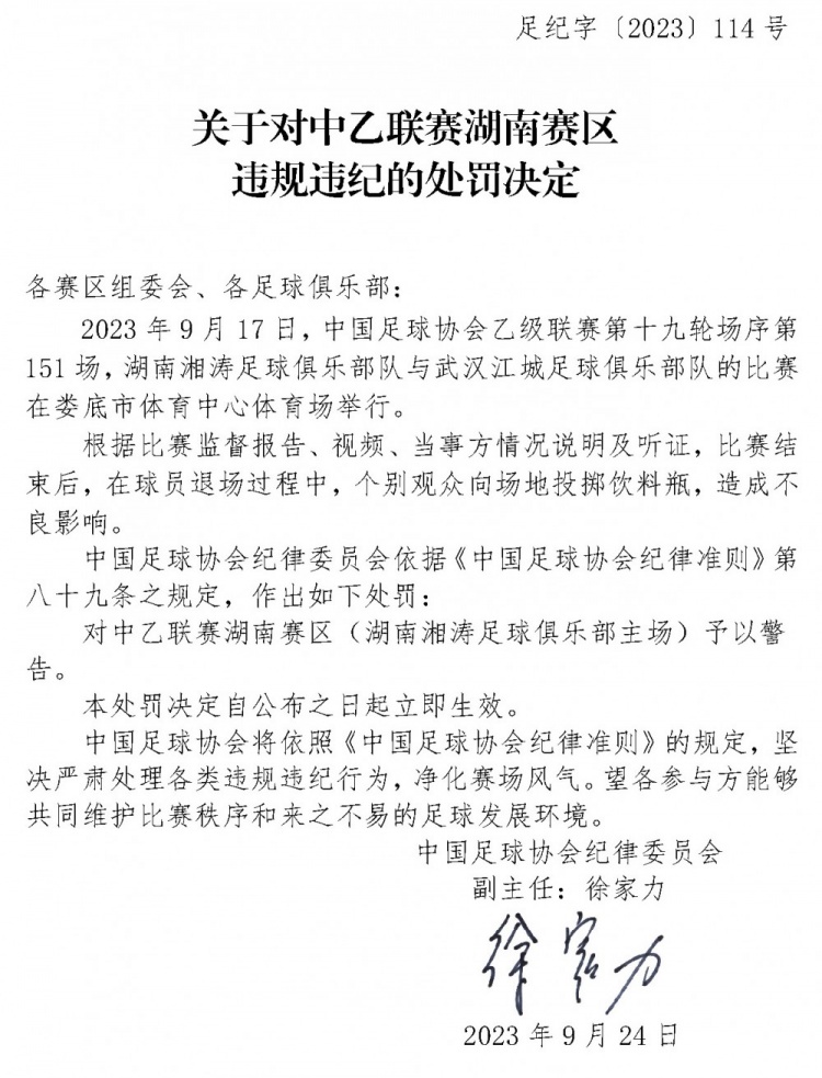 中国足协依据相关规定,对湖南赛区(湖南湘涛俱乐部主场)予以警告。