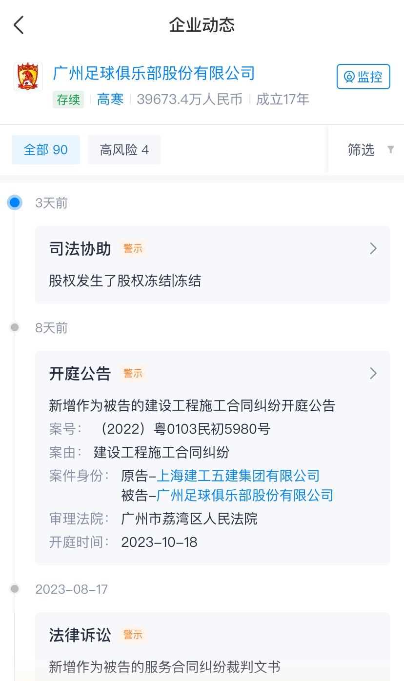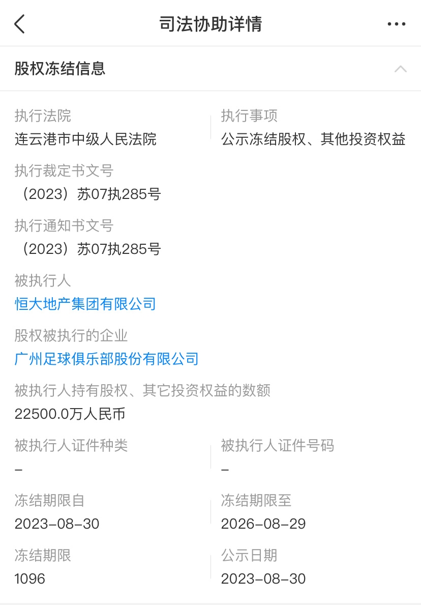 企查查显示,昔日中超八冠王,2届亚冠冠军,现在屈居中甲的广州队股权已经被冻结,执行法院是连云港市中级人民法院,冻结时间为期3年,至2026年8月29日。