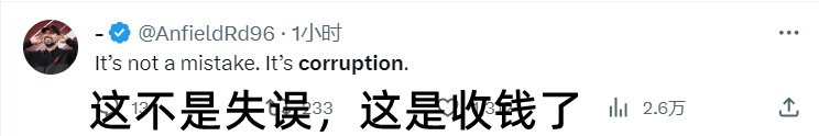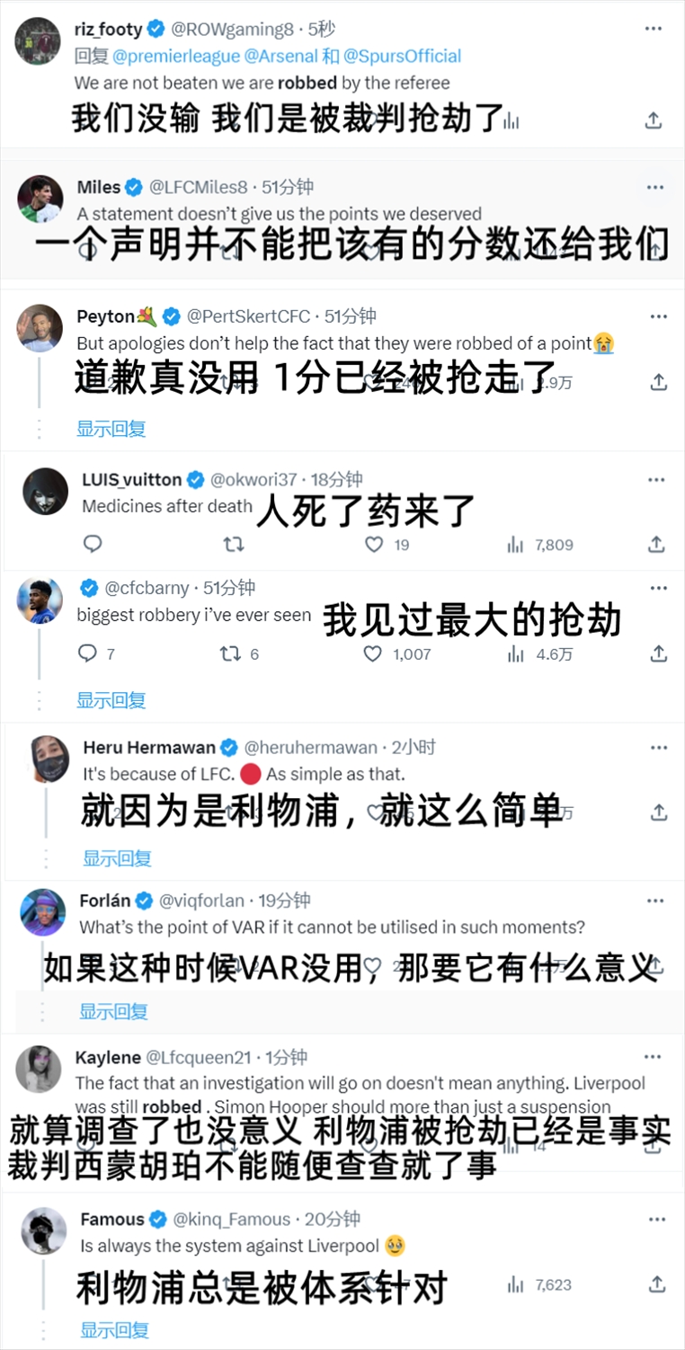 比赛中到比赛后的这段时间里,利物浦比赛相关的词条如“越位”、“不越位”、“抢劫”、“腐败”长时间占据推特英国区的热榜前列。