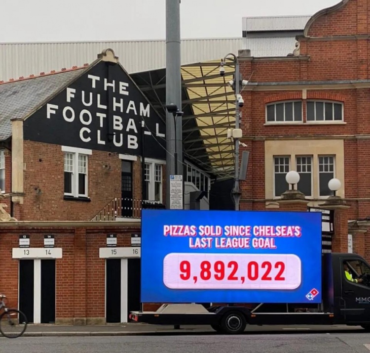 今晚,切尔西将客场挑战富勒姆,蓝军能否打破进球荒也是一个被热议的话题。达美乐这次把对切尔西的嘲讽拉到了克拉文农场之外,他们在克拉文农场设置了一个显示屏,显示的是切尔西在球荒期间,达美乐卖出的披萨数量。目前,达美乐声称已售出9892022份披萨,而且这个数字还在继续变动着。