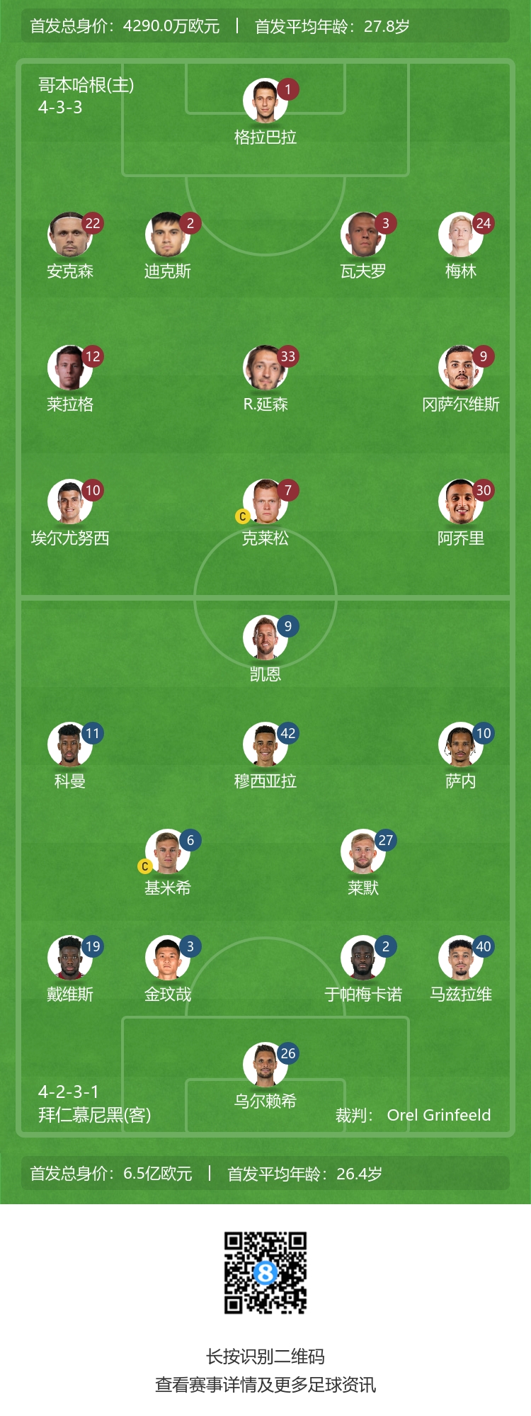 哥本哈根首发:1-格拉巴拉、24-梅林、3-瓦夫罗、2-迪克斯、22-安克森、9-冈萨尔维斯、33-R-延森、12-莱拉格、30-阿乔里、10-埃尔尤努西、7-克莱松