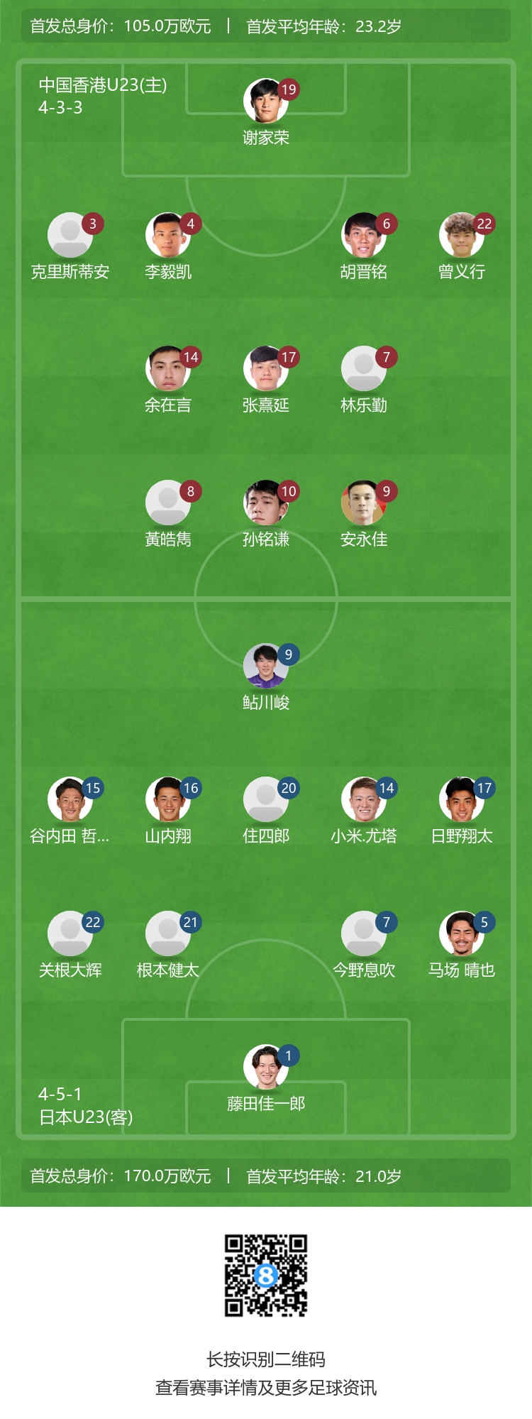 直播吧10月04日讯 今天18:00,杭州亚运会男足半决赛,中国香港vs日本。赛前官方公布双方首发阵容。