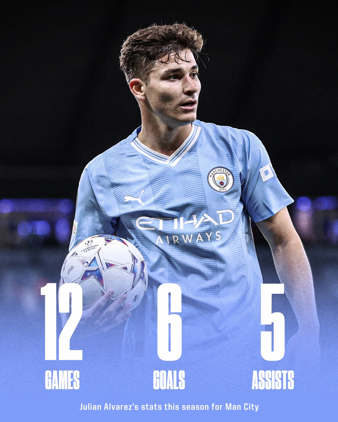 阿尔瓦雷斯本赛季12场6球5助