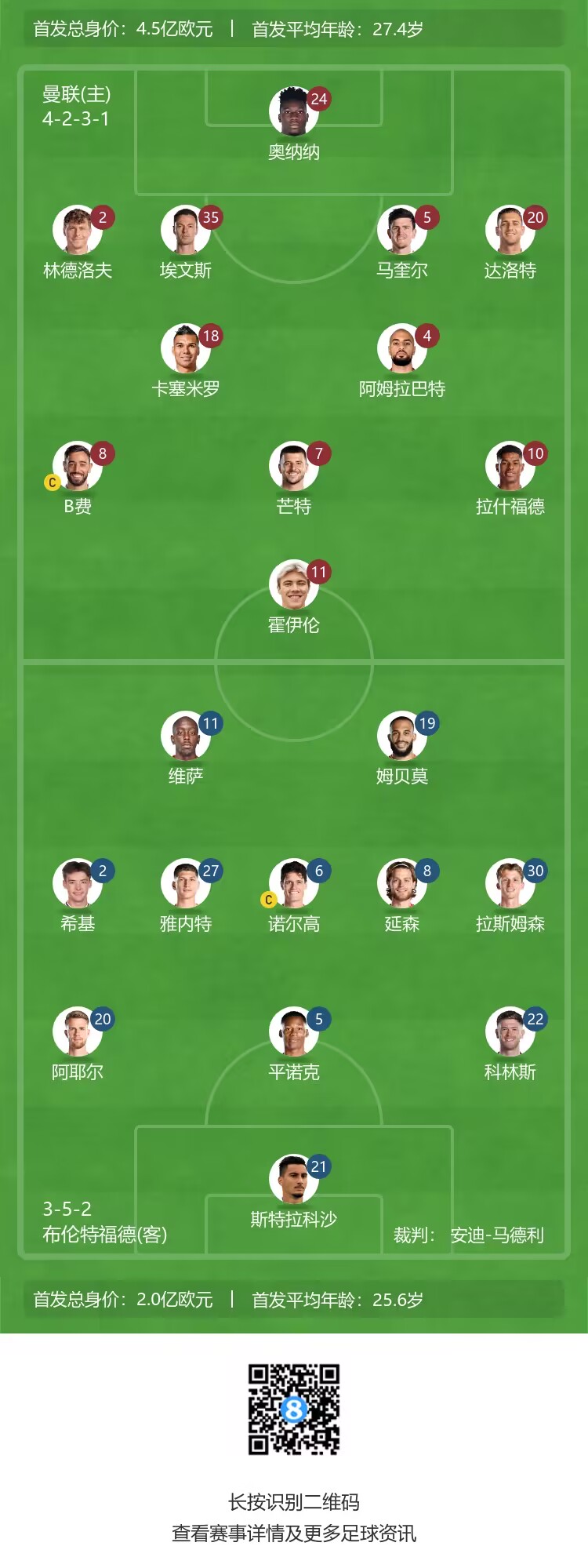 曼联首发:24-奥纳纳、20-达洛特、35-埃文斯、5-马奎尔、2-林德洛夫、4-阿姆拉巴特、18-卡塞米罗、8-B费、10-拉什福德、7-芒特、11-霍伊伦