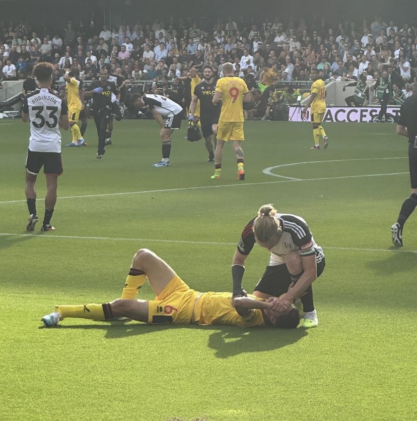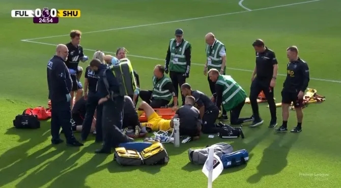 直播吧10月7日讯 英超第8轮,富勒姆主场对阵谢菲联的比赛,比赛上半场发生严重伤情。35岁的谢菲联后卫克里斯-巴沙姆跑动时脚踝突然严重形变骨折。