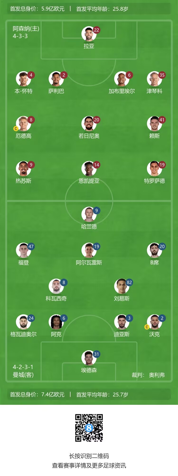 曼城首发:31-埃德森、2-沃克、6-阿克、3-迪亚斯、24-格瓦迪奥尔、82-刘易斯、8-科瓦西奇、20-B席、47-福登、9-哈兰德、19-阿尔瓦雷斯