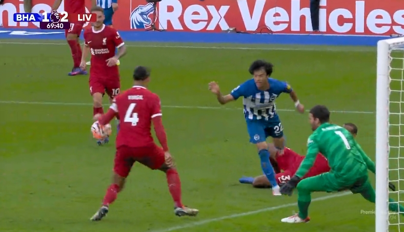利物浦vs布莱顿第70分钟,马蒂普禁区内护球不稳形成混乱,三笘薰一脚打门踢中范迪克左手!