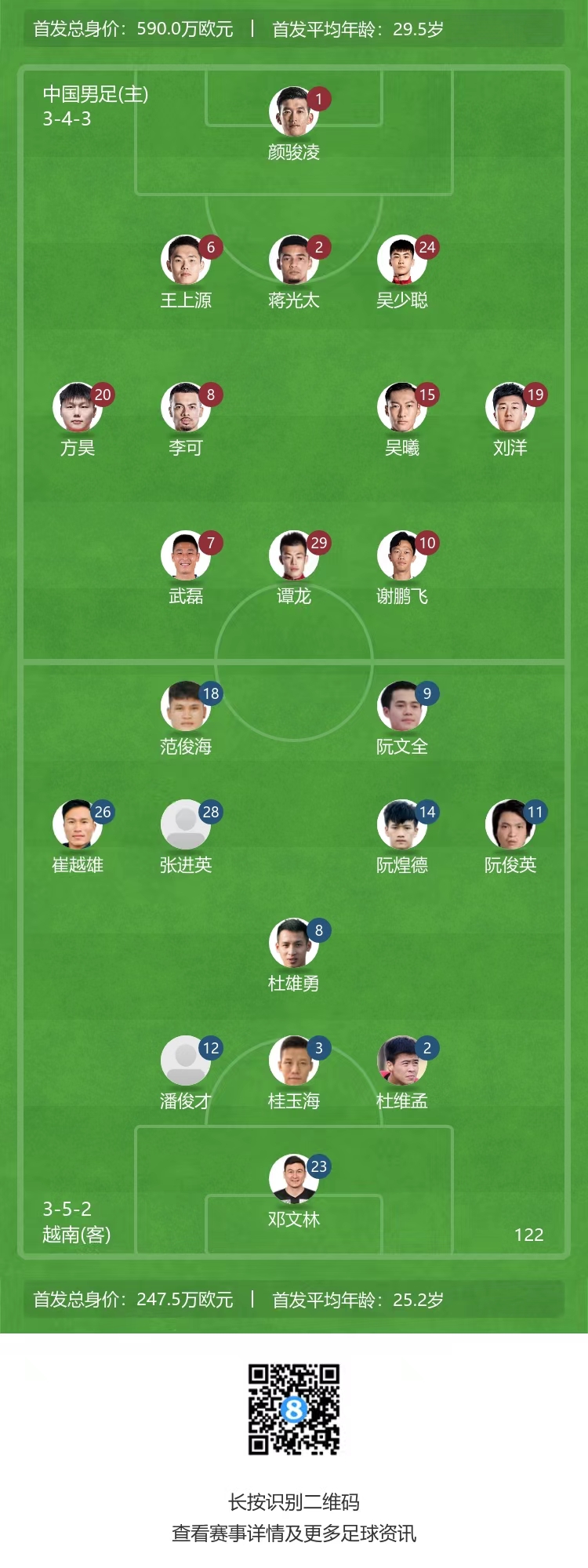 国足首发:1-颜骏凌、2-蒋光太、24-吴少聪、19-刘洋、6-王上源、8-李可、15-吴曦、20-方昊、7-武磊、29-谭龙、10-谢鹏飞