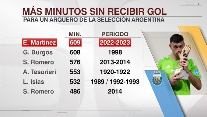 马丁内斯上一次在阿根廷丢球是去年的世界杯决赛,自那以后,他在阿根廷没有再丢过球,至今零封时间已经达到609分钟,创造队史纪录。