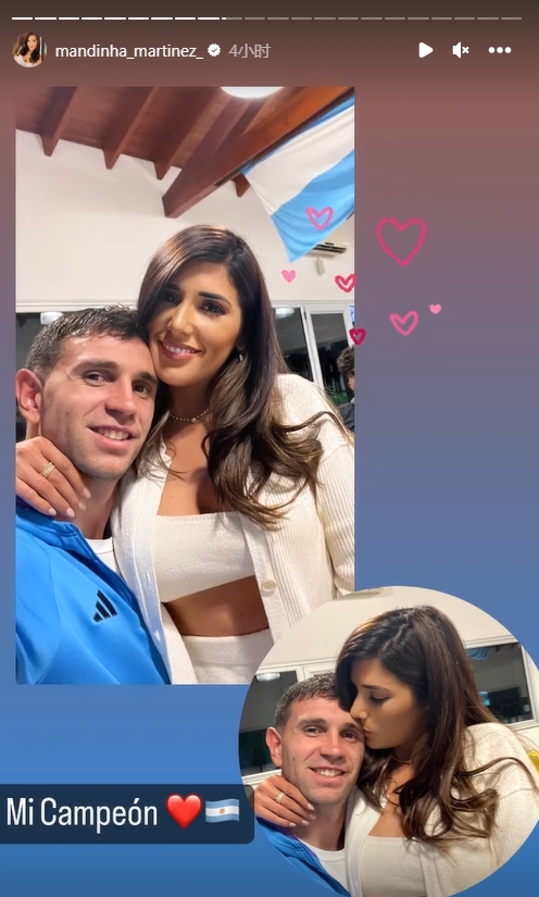 阿根廷门将马丁内斯已622分钟未失球,创造了阿根廷队史纪录。赛后马丁内斯妻子mandinha晒出两人合照,并写道:我的冠军