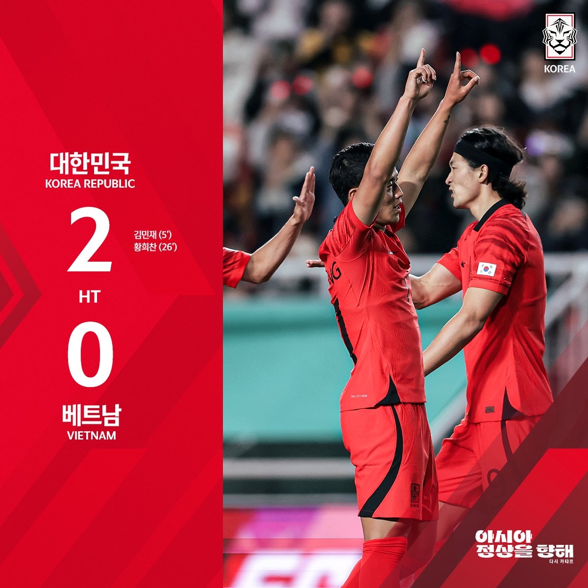 第6分钟,韩国右侧角球机会,金玟哉高高跃起头球破门,韩国1-0越南。↓