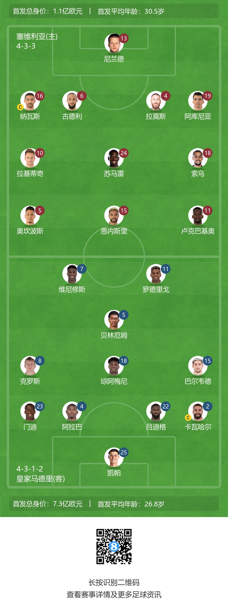 西甲积分榜上,皇马9场8胜1负积24分,排名西甲第1;塞维利亚8场2胜2平4负积8分,排名西甲第14。
