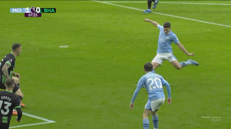 第7分钟,左路多库不讲理加速突破,倒三角传中,阿尔瓦雷斯包抄,疑似踢呲不过歪打正着,皮球弹起旋入球门,曼城1-0领先。