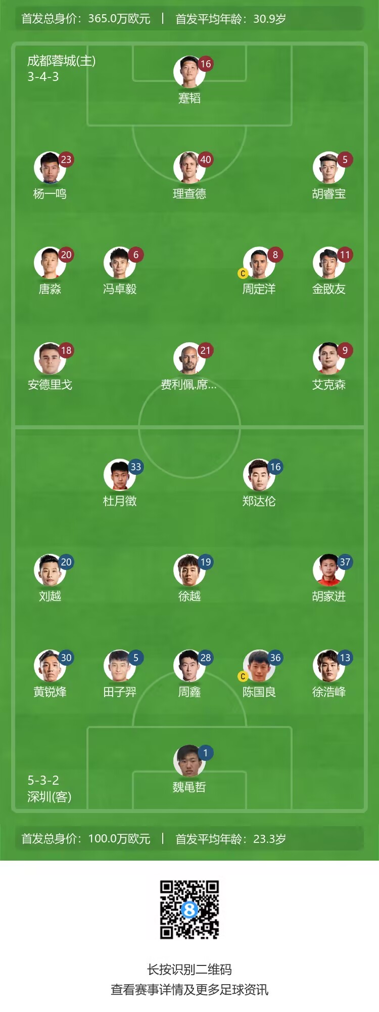 成都蓉城首发:16-蹇韬、5-胡睿宝、20-唐淼、23-杨一鸣、40-理查德、6-冯卓毅、8-周定洋、11-金敃友、9-艾克森、18-安德里戈、21-费利佩