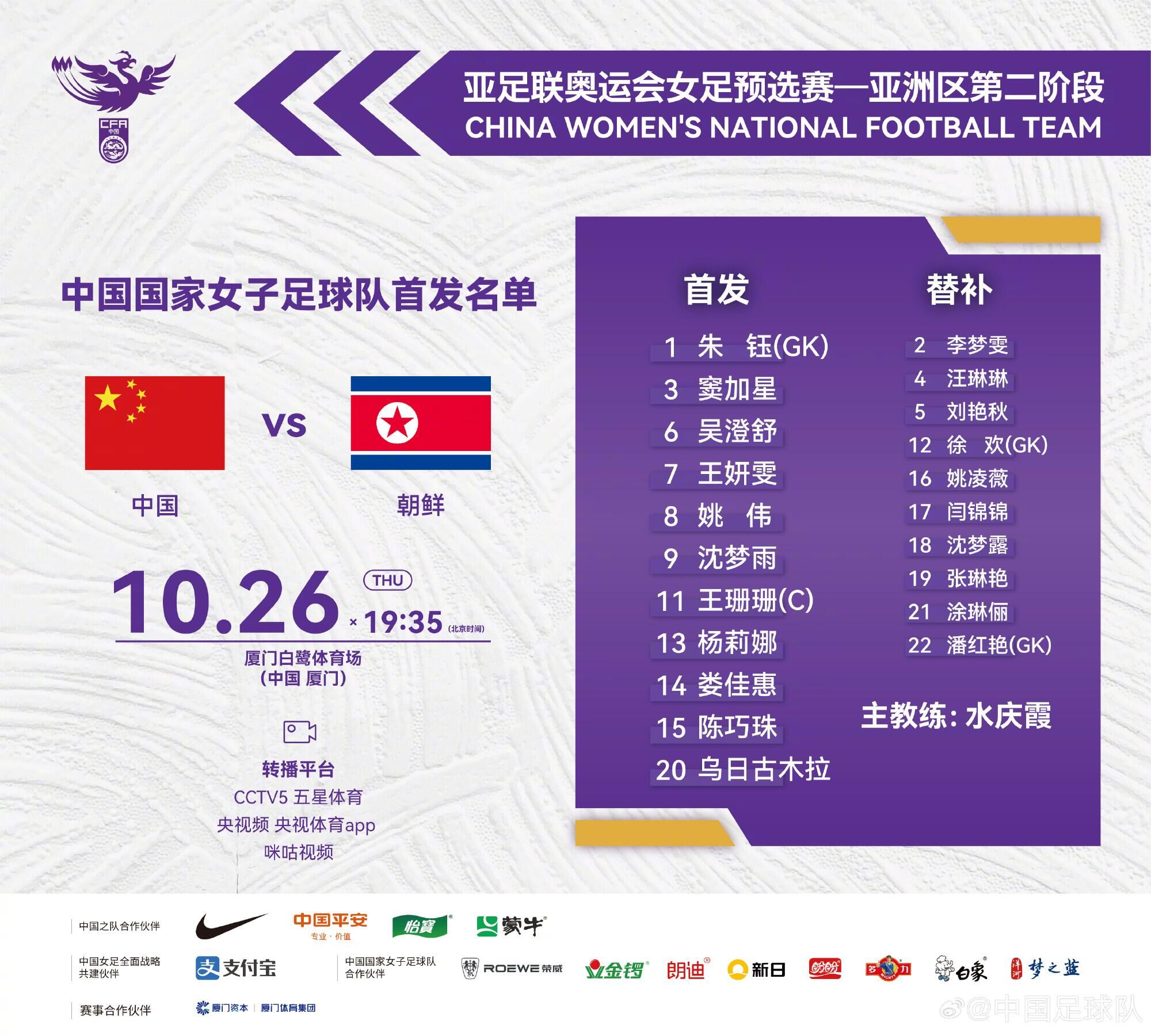直播吧10月26日讯 亚足联奥运会女足预选赛—亚洲区第二阶段B组第1轮,中国女足VS朝鲜女足的比赛将在19:35于厦门白鹭体育场开踢,赛前首发阵容已公布。王霜由于伤病缺席了本阶段的比赛,张琳艳本场则是轻伤替补待命。