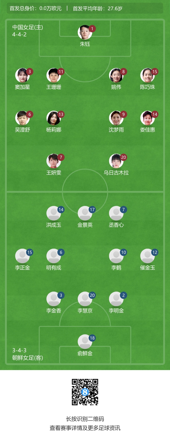 朝鲜女足首发:18-俞鲜金、2-李明金、20-李慧京、3-李金香、15-李钟金、6-明有成、12-崔金玉、10-李鹤、14-洪成玉、17-金景英、7-宋向心