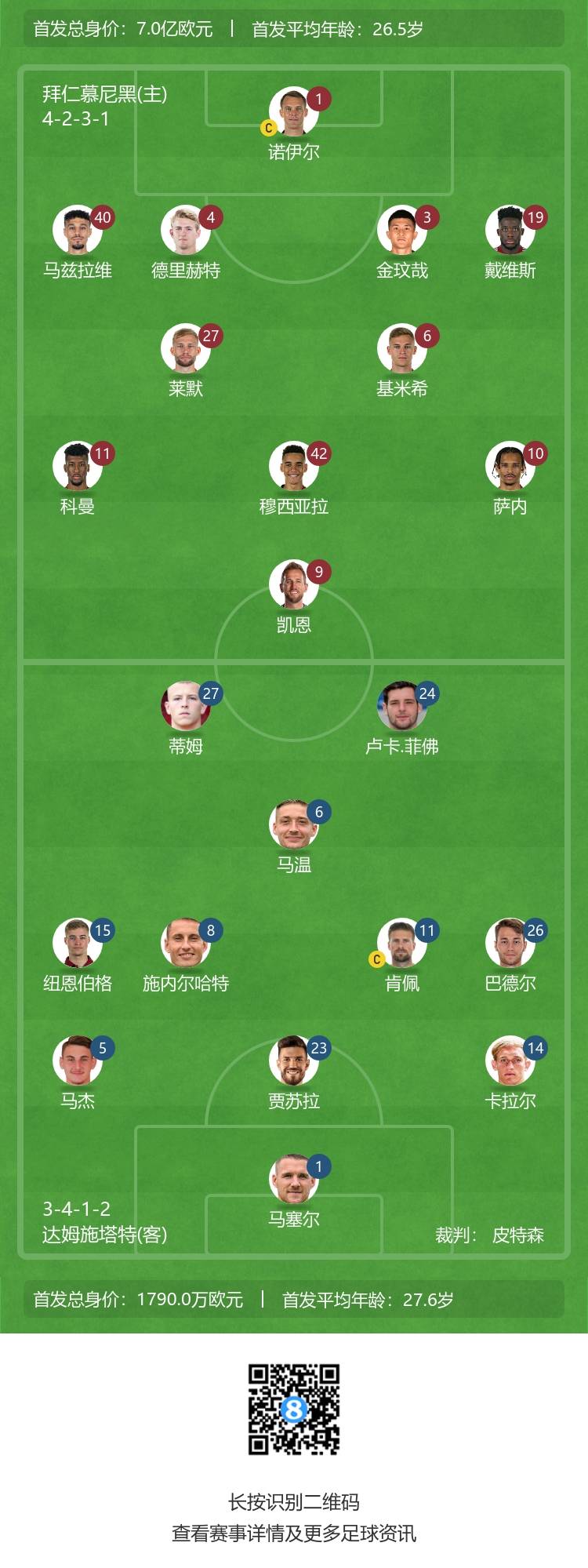 拜仁首发:1-诺伊尔、40-马兹拉维、3-金玟哉、4-德里赫特、19-阿方索-戴维斯、6-基米希、27-莱默尔、10-萨内、11-科曼、42-穆西亚拉、9-凯恩