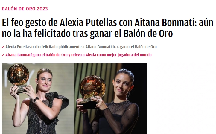 颁奖典礼几小时后,普特拉斯始终没有在公开祝贺她的队友邦马蒂,而其他队友、球员和传奇人物都祝贺了邦马蒂。邦马蒂几乎赢得了国家队和俱乐部级别的所有可能的冠军,其中包括世界杯和女子欧冠冠军,而2021年和2022年金球奖得主正是她的队友普特拉斯。