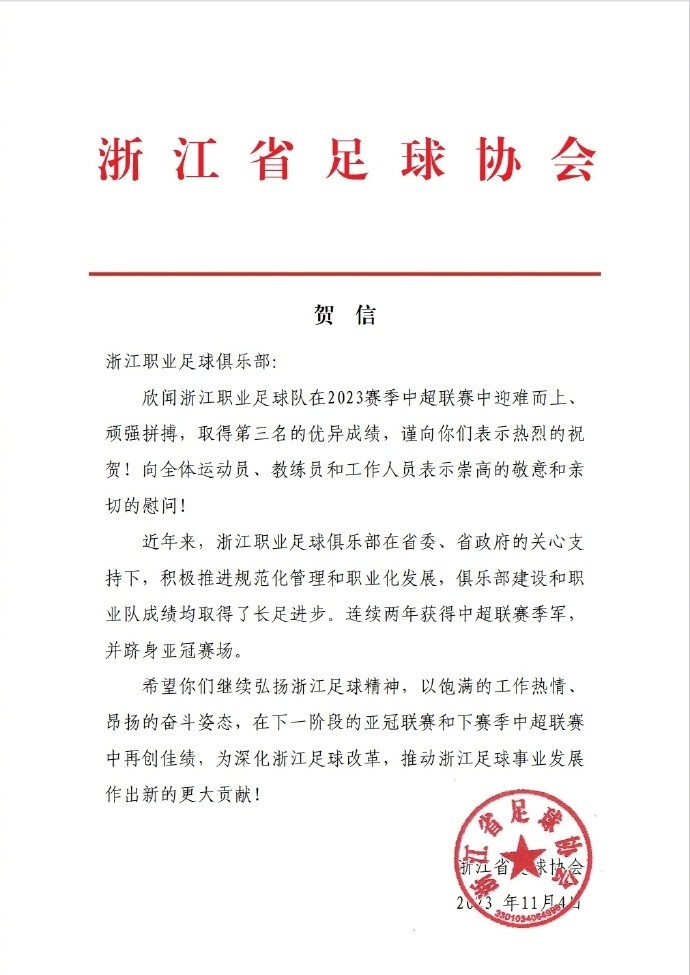 欣闻浙江职业足球队在2023赛季中超联赛中迎难而上、顽强拼搏,取得第三名的优异成绩,谨向你们表示热烈的祝贺!向全体运动员、教练员和工作人员表示崇高的敬意和亲切的慰问!