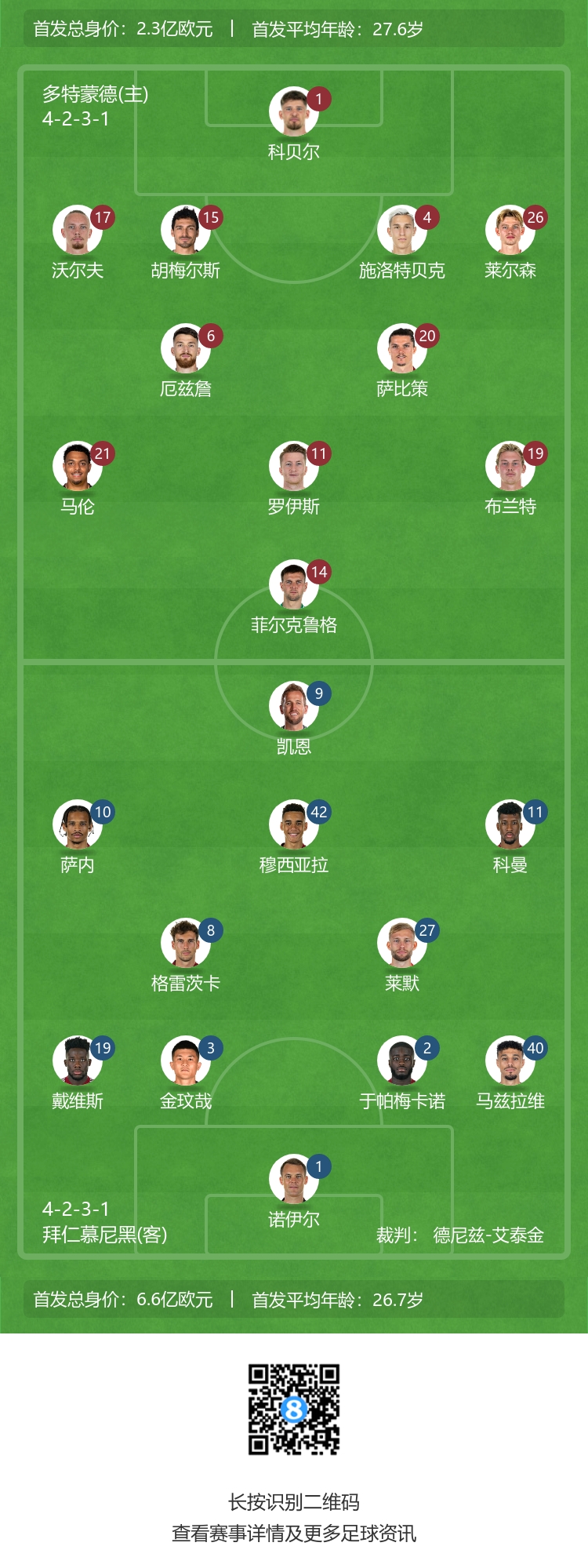 拜仁首发:1-诺伊尔、19-戴维斯、2-于帕、3-金玟哉、40-马兹拉维、8-格雷茨卡、27-莱默尔、10-萨内、11-科曼、42-穆西亚拉、9-凯恩