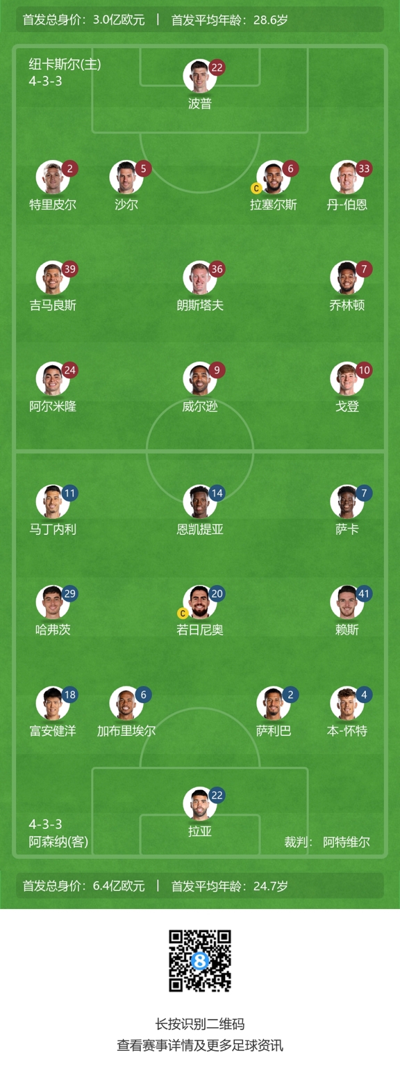 纽卡首发:22-波普、2-特里皮尔、6-拉塞尔斯、5-沙尔、33-丹-伯恩、39-吉马良斯、36-朗斯塔夫、7-乔林顿、24-阿尔米隆、10-戈登、9-威尔逊