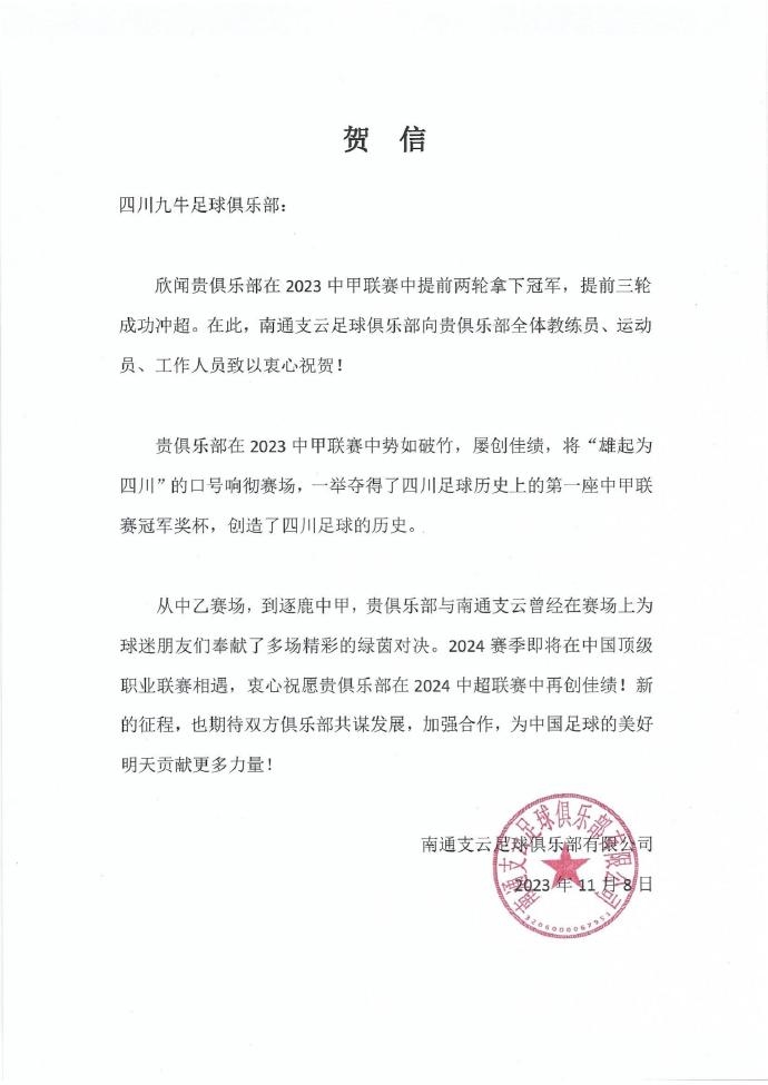 欣闻贵俱乐部在2023中甲联赛中提前两轮拿下冠军,提前三轮成功冲超。在此,南通支云足球俱乐部向贵俱乐部全体教练员、运动员、工作人员致以衷心祝贺!