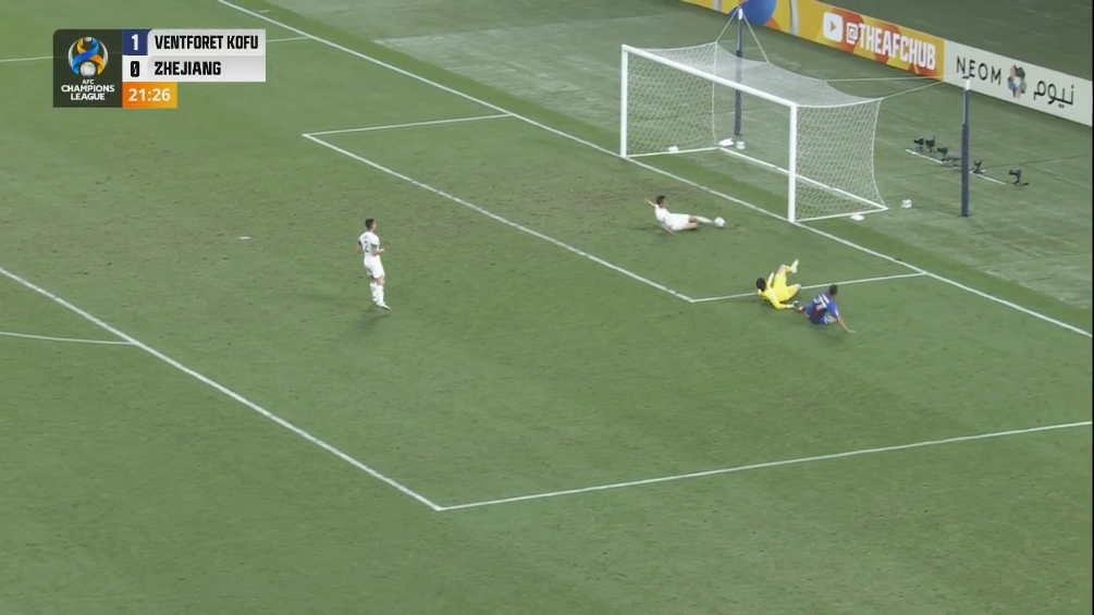 第21分钟,甲府外援热图利奥获得单刀机会,他过掉门将赵博打空门,浙江后卫董宇飞身在门线前将球解围,浙江队逃过一劫。