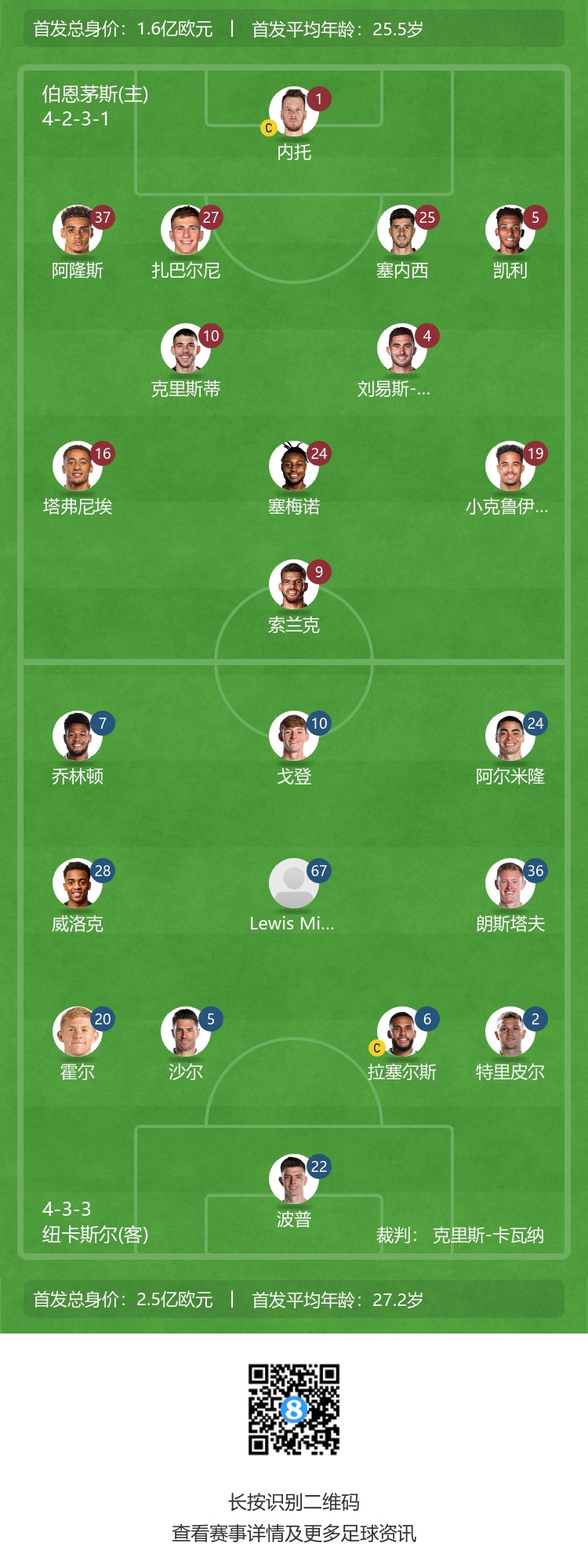 纽卡首发:22-波普、2-特里皮尔、6-拉塞尔斯、5-沙尔、20-霍尔、67-刘易斯-米利、36-肖恩-朗斯塔夫、7-乔林顿、24-阿尔米隆、28-威洛克、10-安东尼-戈登