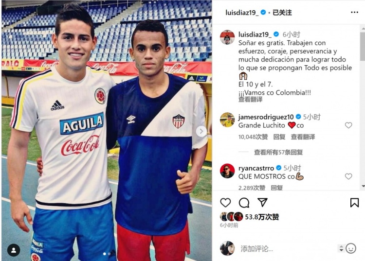 直播吧11月24日讯 哥伦比亚前锋路易斯-迪亚斯更新社媒动态,晒出与J罗昔日、现在的合照。
