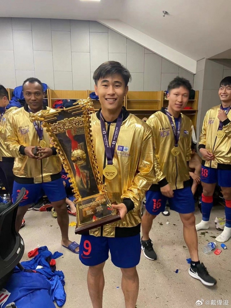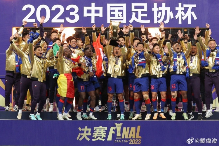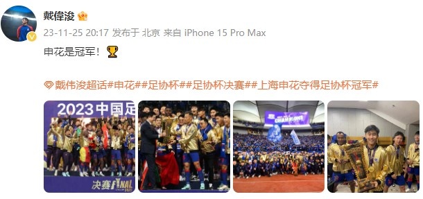 直播吧11月25日讯 2023足协杯决赛,上海申花1-0山东泰山,夺得足协杯冠军。本场比赛,戴伟浚替补出场,赛后,他在社媒晒球队庆祝夺冠的照片,并配文:“申花是冠军!”