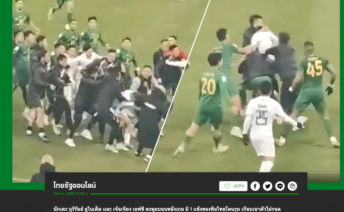 泰媒表示,比赛结束后的画面显示,两队出现问题,冲向对方互殴。被袭击最严重的是武里南联10号球员谢伊达耶夫,情况糟糕得几乎无法逃脱。