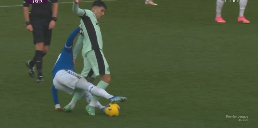 直播吧12月10日讯 英超第16轮,切尔西客战埃弗顿,比赛第16分钟,恩佐中场控球,盖耶身后对恩佐放铲,裁判吹罚犯规并出示黄牌。