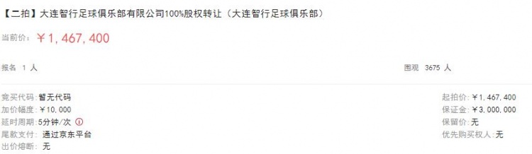 目前大连智行俱乐部的第二次司法拍卖正在进行当中,起拍价仍为146.74万元,今早9点18分已有买家按照起拍价拍下,至少已经能够确保这一次不会流拍。