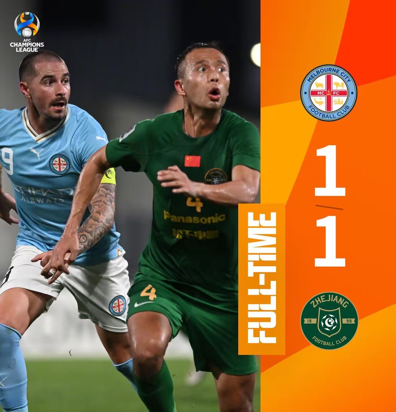 直播吧12月12日讯 亚冠H组末轮,浙江队客场挑战澳超球队墨尔本城。上半场,顾斌一次好机会射门被封堵,浙江队四人染黄。易边再战,墨尔本城两次进球被吹后由阿尔斯兰破门制胜,VAR介入取消墨尔本城点球,读秒阶段穆谢奎头球绝平,王东升染红。最终浙江队1-1墨尔本城小组赛出局,结束本赛季的亚冠征程。积分榜方面,浙江队2胜1平3负积7分小组第三,墨尔本城9分小组第二。