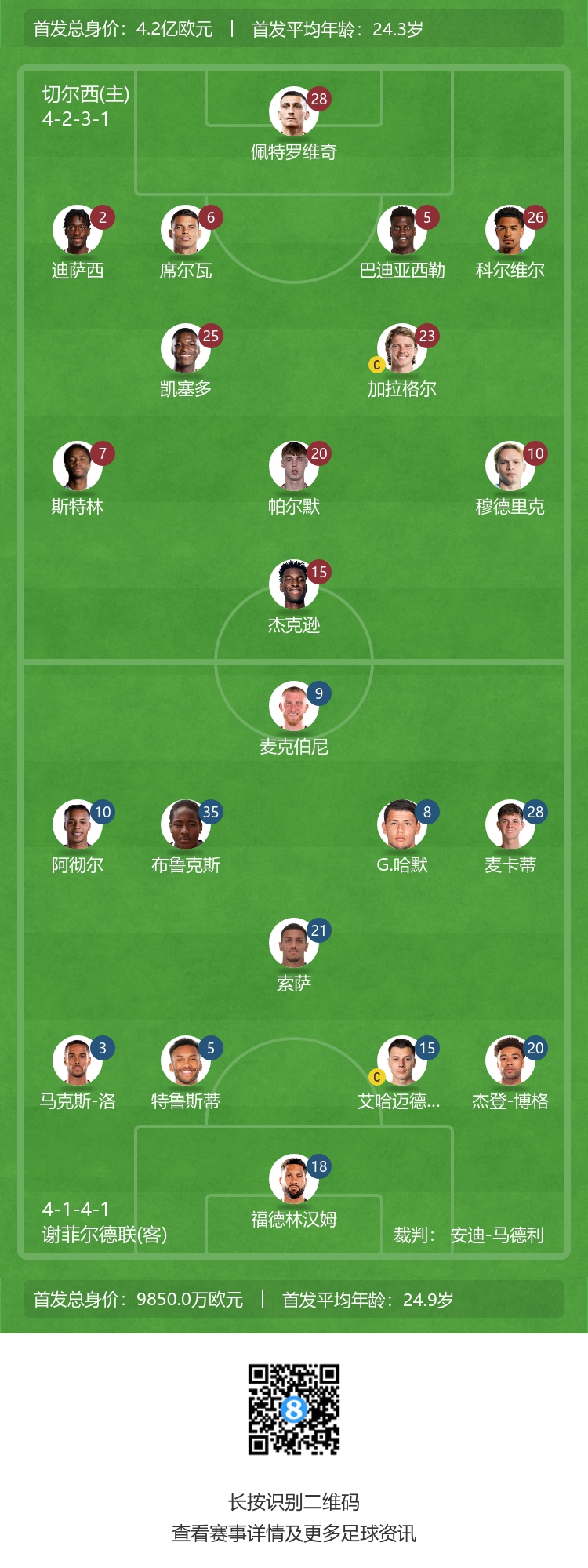 切尔西首发:28-佩特洛维奇、2-迪萨西、6-蒂亚戈-席尔瓦、5-巴迪亚西勒、26-科尔维尔、25-凯塞多、23-加拉格尔、20-帕尔默、7-斯特林、10-穆德里克、15-杰克逊