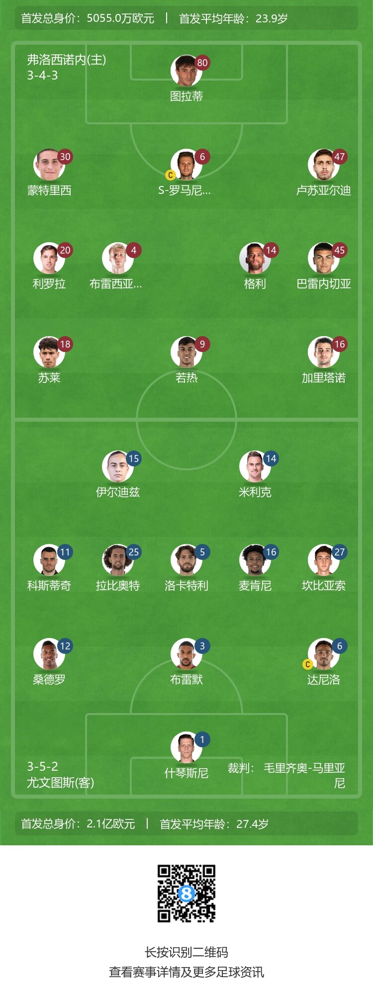 弗洛西诺内替补:1-弗拉塔利、31-切罗福利尼、8-卢利奇、21-哈鲁伊、24-布拉比亚、7-巴埃斯、10-卡索、11-库尼、17-克韦纳泽、26-比达维、70-切蒂拉