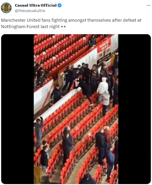 直播吧1月1日讯 在上周末英超曼联输给诺丁汉森林后,比赛现场有人发现曼联球迷看台发生了打架事件。