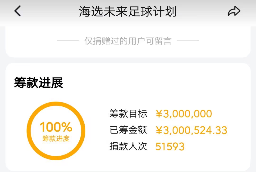 直播吧01月07日讯 中国足球名宿孙继海1月4日在社交媒体上宣布,发起海选未来足球计划,目标是培养进军五大联赛立足英超的中国国脚,并发起众筹。目前,300万元的筹款目标在短短几天内已经完成!捐款人次高达51593!