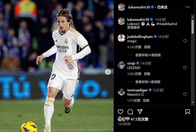 维尼修斯评论:传奇。贝林厄姆和吕迪格分别称赞他“魔法”和“大师”。梅开二度的何塞卢写道:我最爱的兄弟。