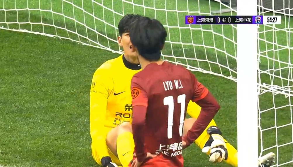 直播吧02月25日讯 超级杯海港vs申花第56分钟,申花角球开出,颜骏凌用脚挡出,马莱莱打空门得手。丢球后,颜骏凌朝着吕文君方向连续抱怨。