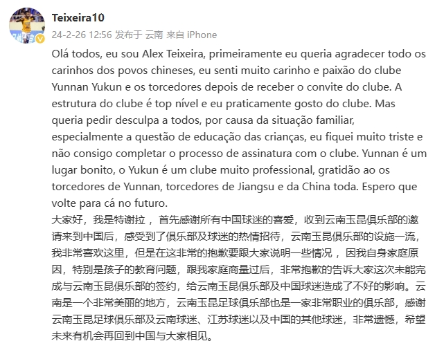 特谢拉写道:大家好,我是特谢拉 ,首先感谢所有中国球迷的喜爱,收到云南玉昆俱乐部的邀请来到中国后,感受到了俱乐部及球迷的热情招待,云南玉昆俱乐部的设施一流,我非常喜欢这里,但是在这非常的抱歉要跟大家说明一些情况 ,因我自身家庭原因,特别是孩子的教育问题,跟我家庭商量过后,非常抱歉的告诉大家这次未能完成与云南玉昆俱乐部的签约,给云南玉昆俱乐部及中国球迷造成了不好的影响。