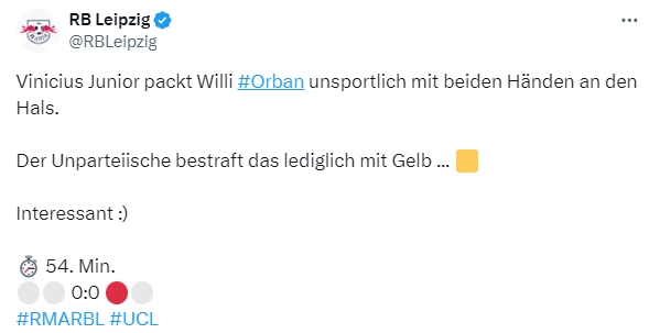 莱比锡官推写道:“维尼修斯以非体育的方式用双手掐住奥尔班的脖子,主裁判只给了黄牌……🟨有趣 :) ”